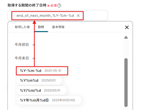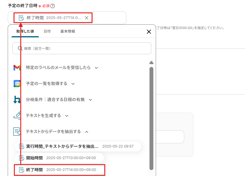 予定の終了日時は、取得した値から終了時間を選択してください。