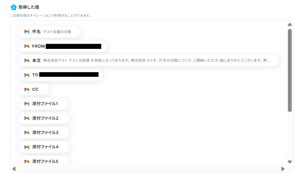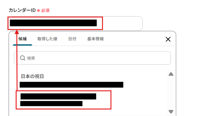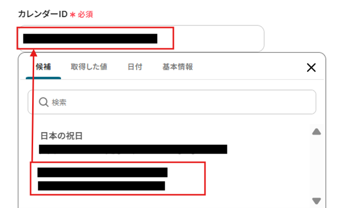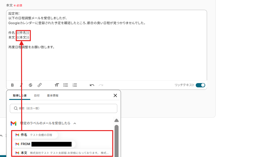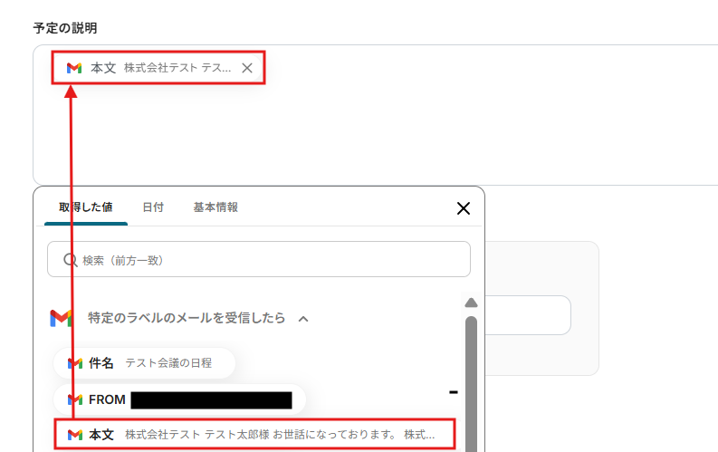 予定の説明には、メールの本文を入れておきましょう。取得した値から「本文」を入力してください。