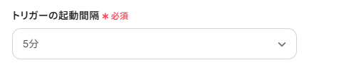 「トリガー起動間隔」は、プルダウンメニューから選んでください。タイミングは5分、10分、15分、30分、60分の中から選べます。