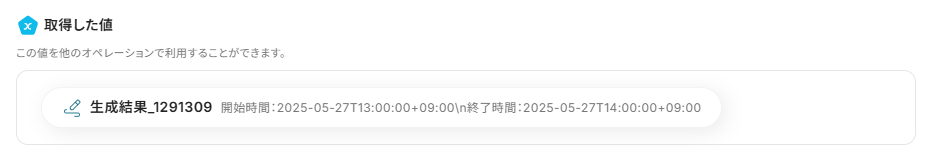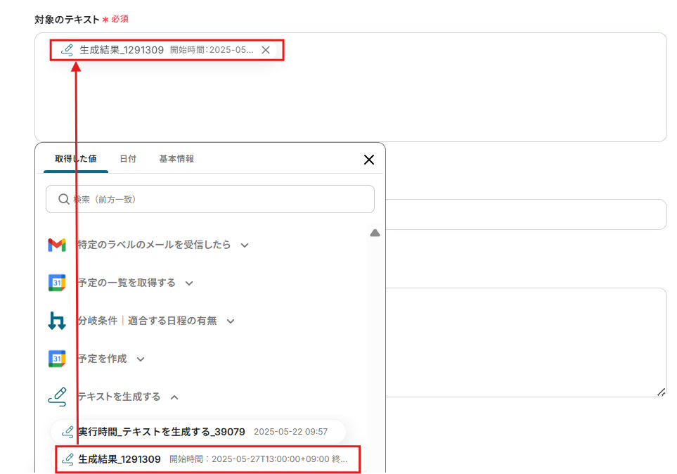 対象のテキストに取得した値から「生成結果」を選択して入力してください。