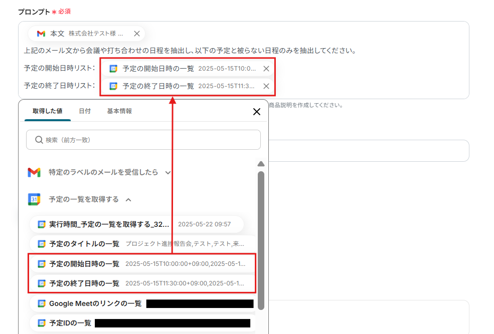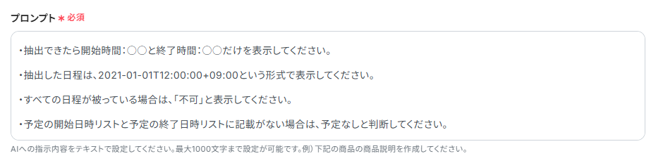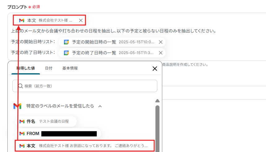 本文に反映させる項目は取得した値から選択できます。固定のプロンプトは手入力しましょう。