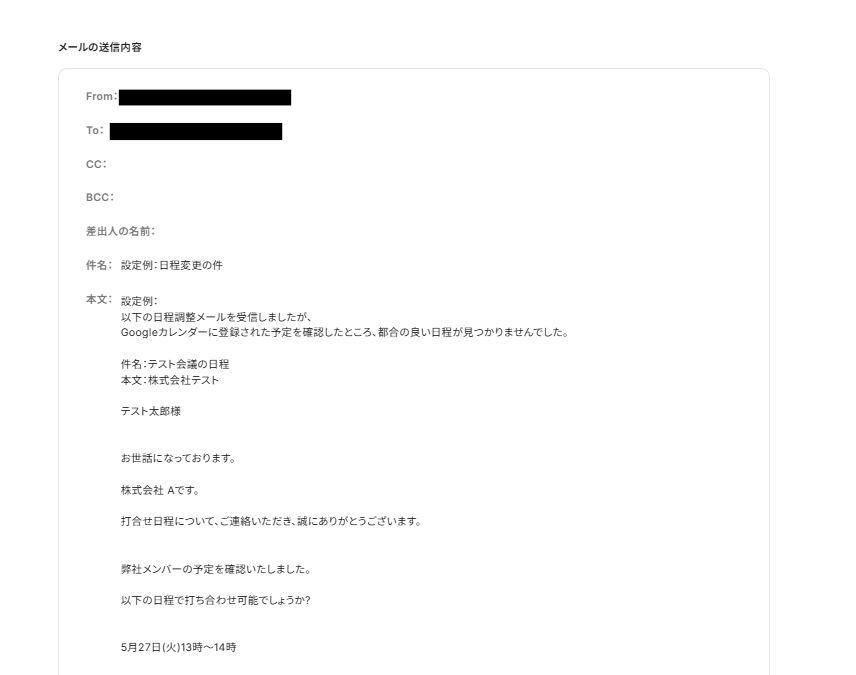 メールで提案してもらった日程が空いていなかった場合にメールを送る設定です。