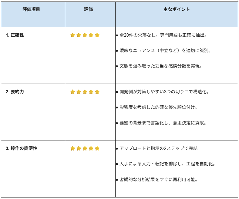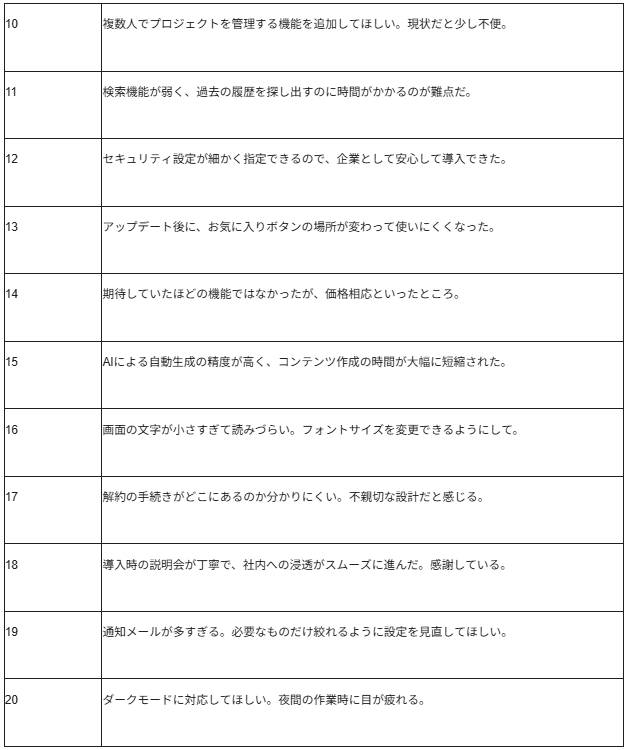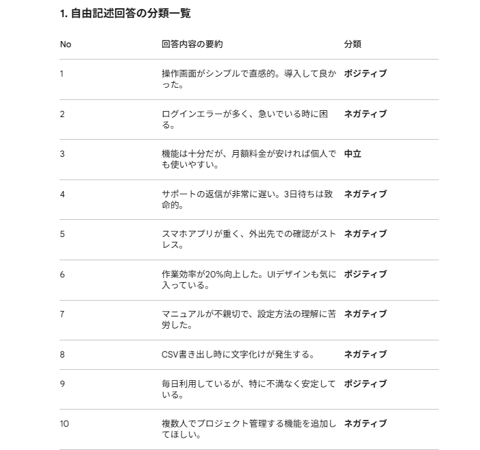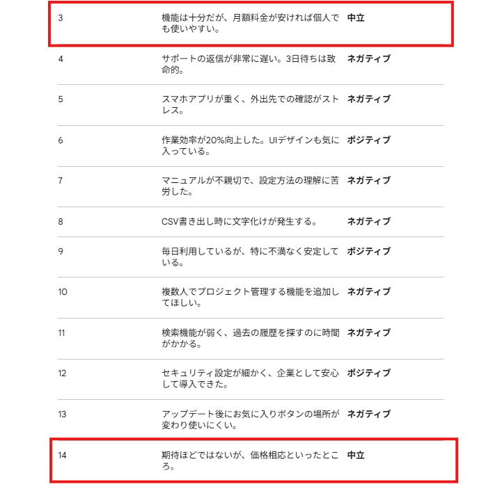 「導入して良かった(ポジティブ)」「ログインエラー(ネガティブ)」「価格相応(中立)」など、文脈を正しく汲み取った分類が行われています。 - データの欠落なし: