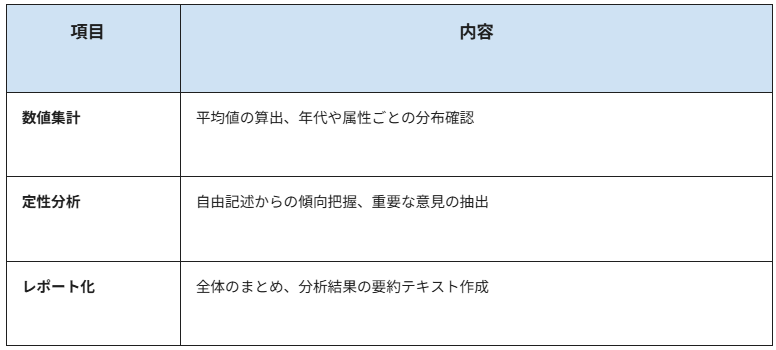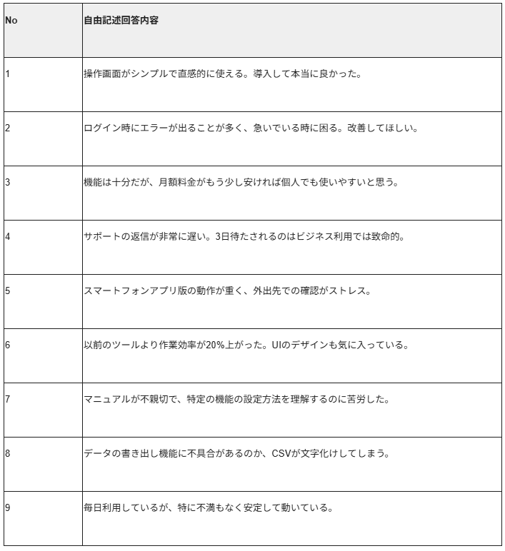 - 重要意見の抽出:長文の自由記述から、核心となる意見をピックアップする。