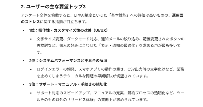 単なる「まとめ」に留まらず、「なぜそれが要望の1位なのか」という背景まで含めて言語化されているため、意思決定の材料として有用です。