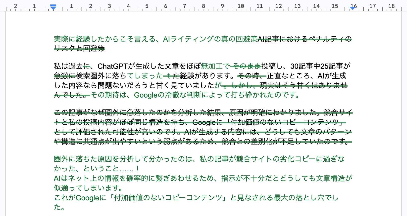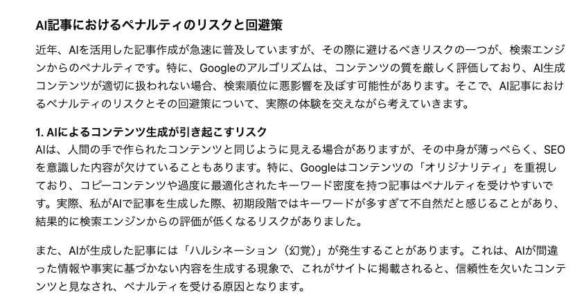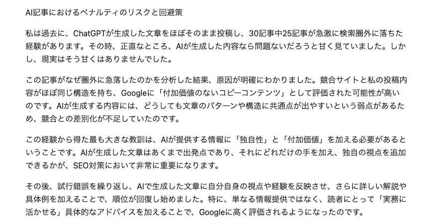以下の【独自の体験談】をベースに、「AI記事におけるペナルティのリスクと回避策」という見出しの本文を、800文字程度で執筆してください。