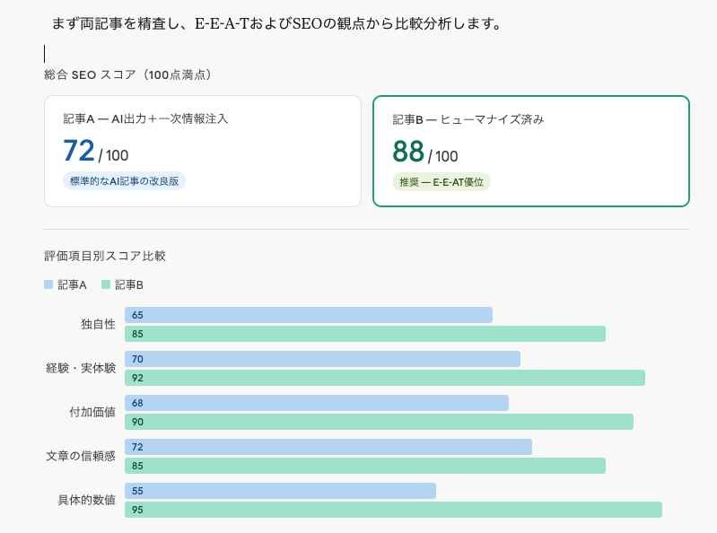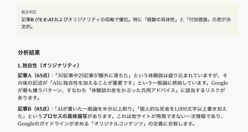 あなたはGoogleの検索品質評価ガイドラインに精通した、シニアSEOディレクターです。 以下の【記事A】と【記事B】を比較し、どちらが検索エンジンにおいて、オリジナリティとE-E-A-Tの観点で高く評価されるか、客観的に分析してください。