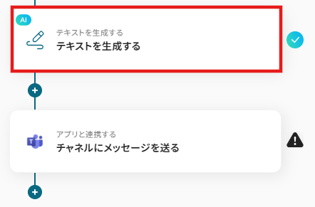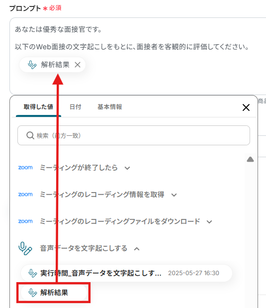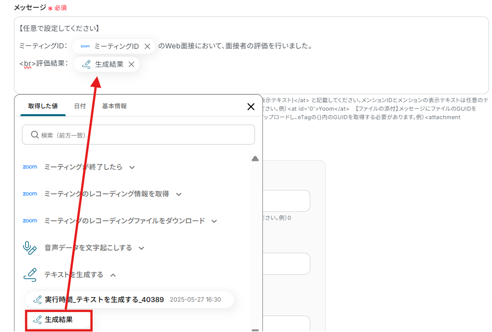 - 次に、オペレーションの「テキスト生成機能:テキストを生成する」アクションで、文字起こしされたテキストを基にAIによる面接者の評価を生成します。