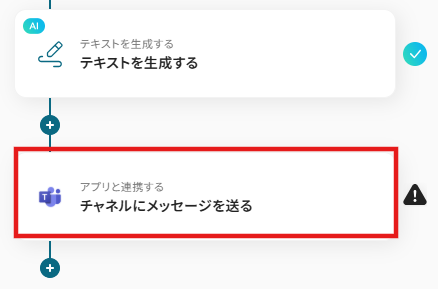 - 最後に、オペレーションでMicrosoft Teamsを選択し、「チャネルにメッセージを送る」アクションを設定します。ここで、AIによって生成された面接の質問案を指定したチャネルに通知するように設定します。