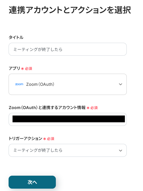- 次に、トリガーとしてZoomを選択し、「ミーティングが終了したら」というアクションを設定します。