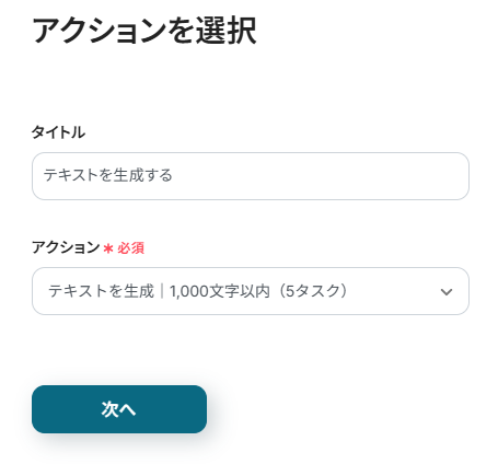 - 「テキスト生成機能:テキストを生成する」オペレーションでは、生成するテキストの文字数に応じてアクションを設定し、評価の観点などを指示するプロンプトや出力したい言語を任意で指定してください。