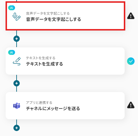 - ダウンロードした音声データを、オペレーションの「文字起こし機能:音声データを文字起こしする」アクションを使用してテキストに変換します。