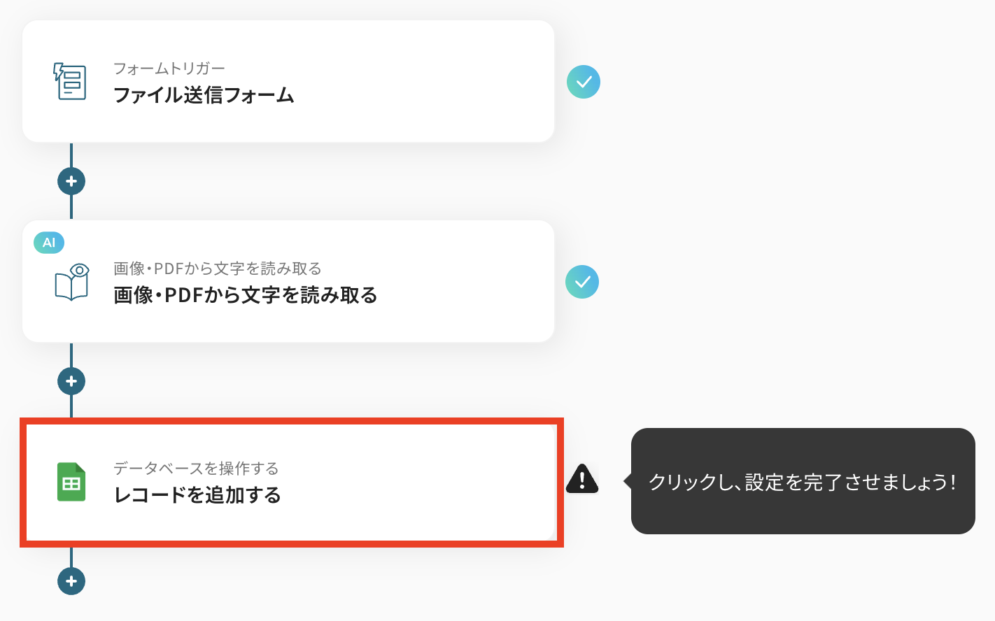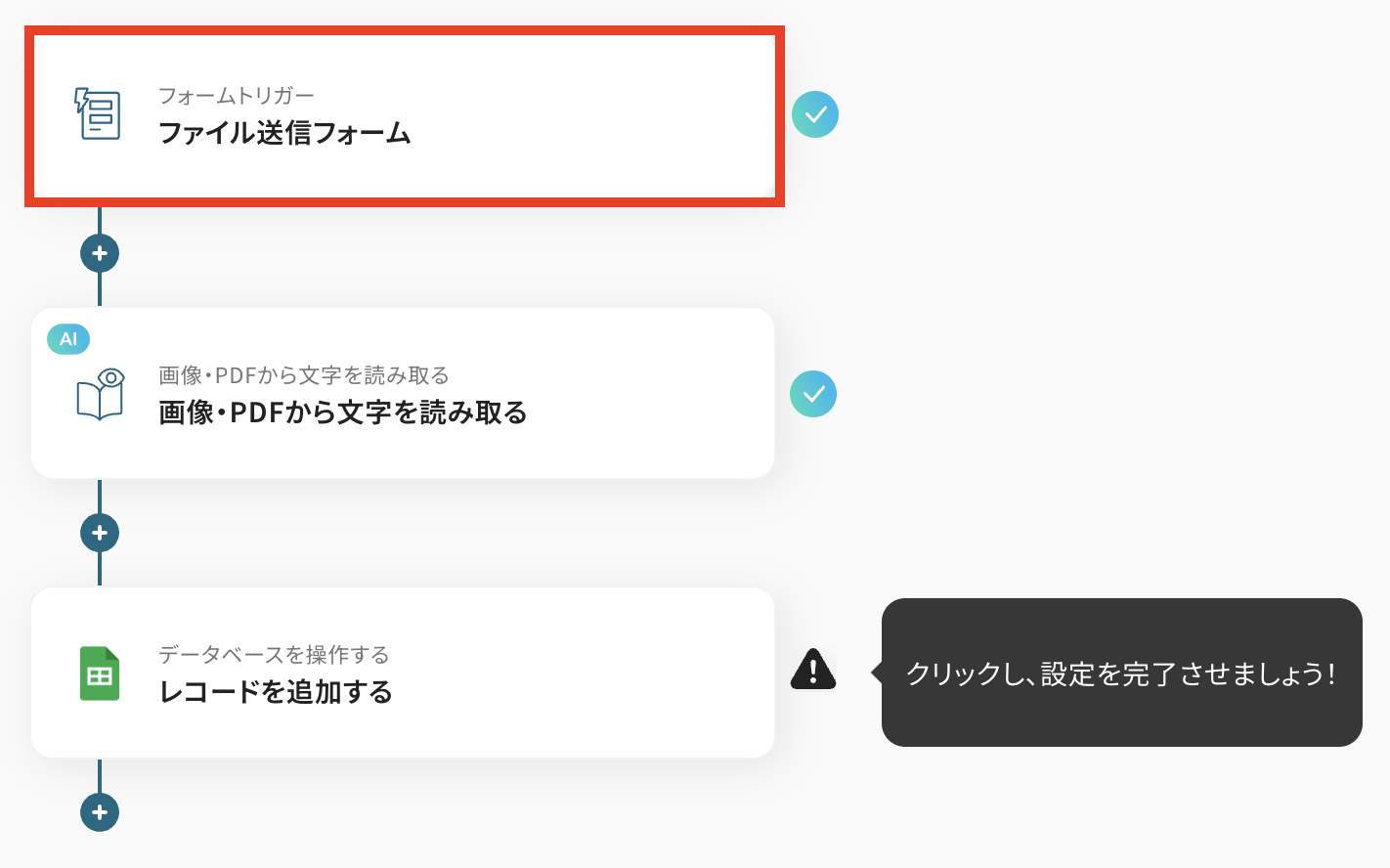 それではさっそく自動化の設定をはじめていきましょう。 今回は記録先をGoogle スプレッドシートとし、一例として「フォームにPDFファイルが送信されたら、OCRで全文を読み取り、その内容をGoogle スプレッドシートに自動で追加する」 フローの作成手順をご紹介します!