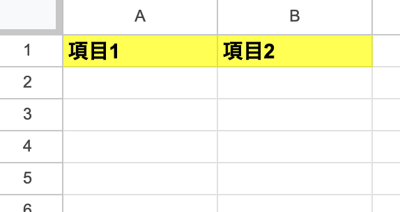 次に、OCRで読み取ったテキストデータを、Google スプレッドシートにどのように追加するかを設定します。 今回は、以下のようなシートを用意し、項目1にファイル名、項目2にOCRで読み取った文章を追加する想定で説明します。