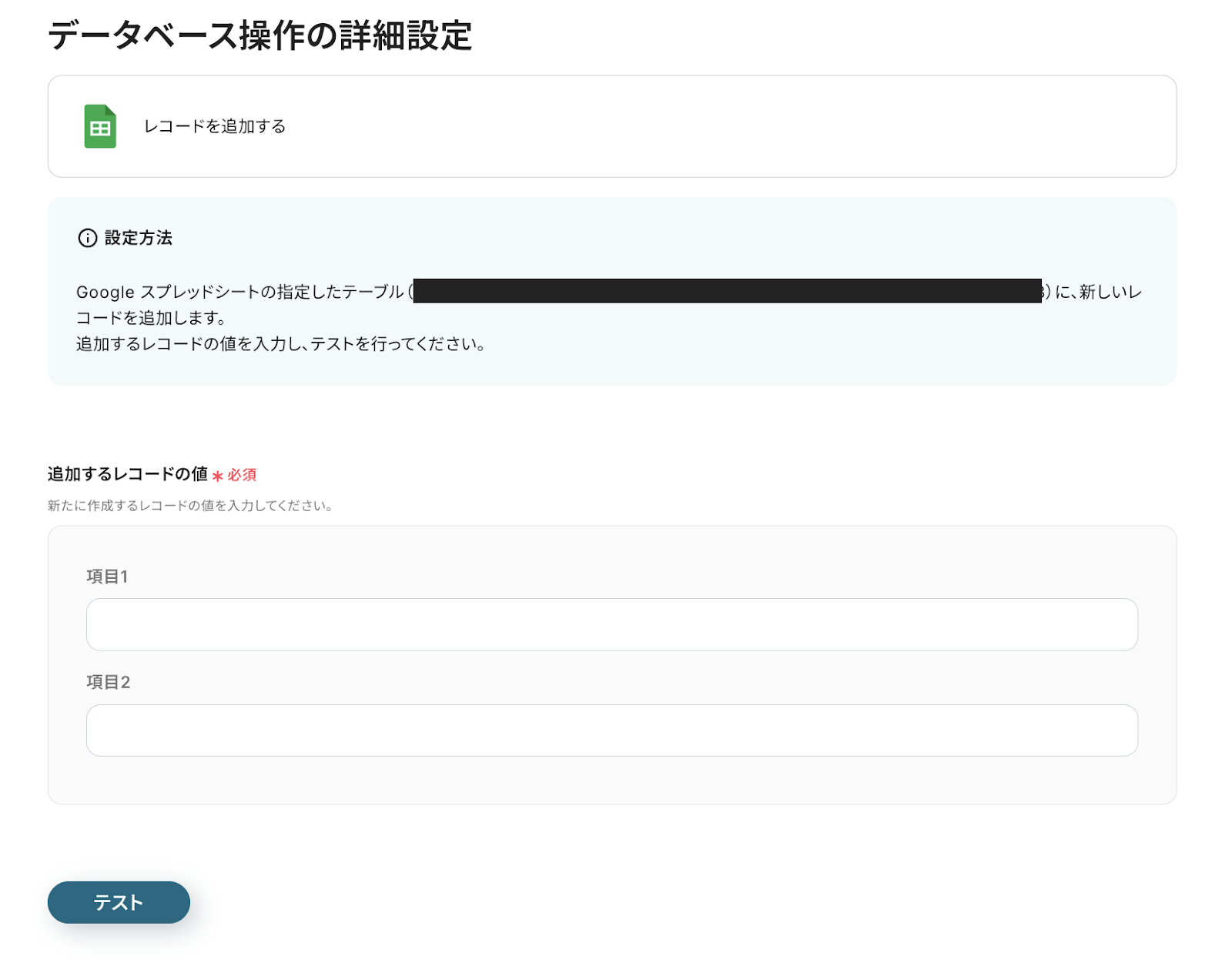 設定したら「テスト」をクリックし、指定したシートに情報が追加されているか確認してみましょう。 今回は以下のように反映されました。