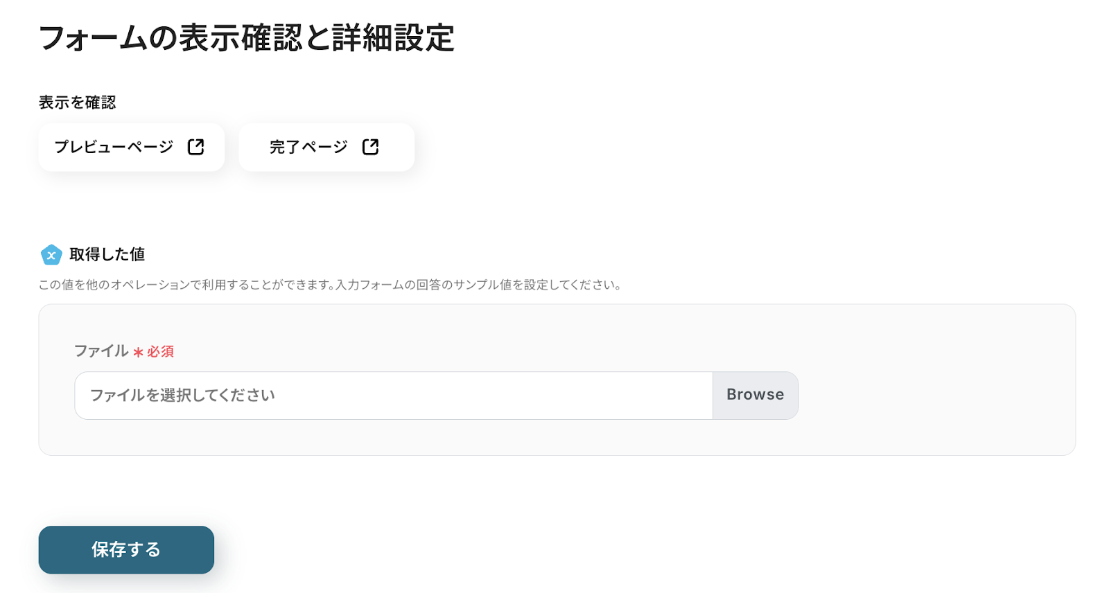 フロー編集画面で、まずトリガーとなるフォームの設定を行います。以下の赤枠「ファイル送信フォーム」をクリックしてください。 デフォルトで設定済みになっていますが、使い方に応じて内容を編集することができるので、一度確認してみましょう!