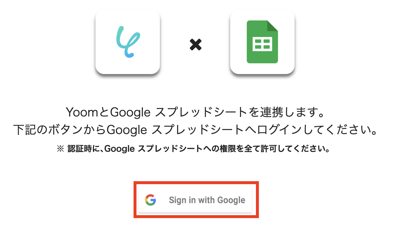 次に、アプリ一覧の右上の検索窓からGoogle スプレッドシートを検索し、アプリを選択します。 以下の画面で「Sign in with Google」をクリックし、連携するGoogleアカウントにログインします。