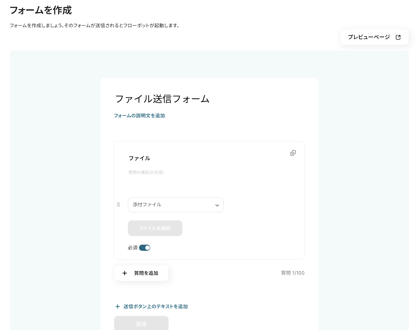 以下のように、フォームの入力項目や送信完了画面のテキストなど、自由にカスタマイズ することができます。右上の「プレビューページ」をクリックしてフォームの完成形を確認しながら、必要に応じてフォームを編集しましょう。