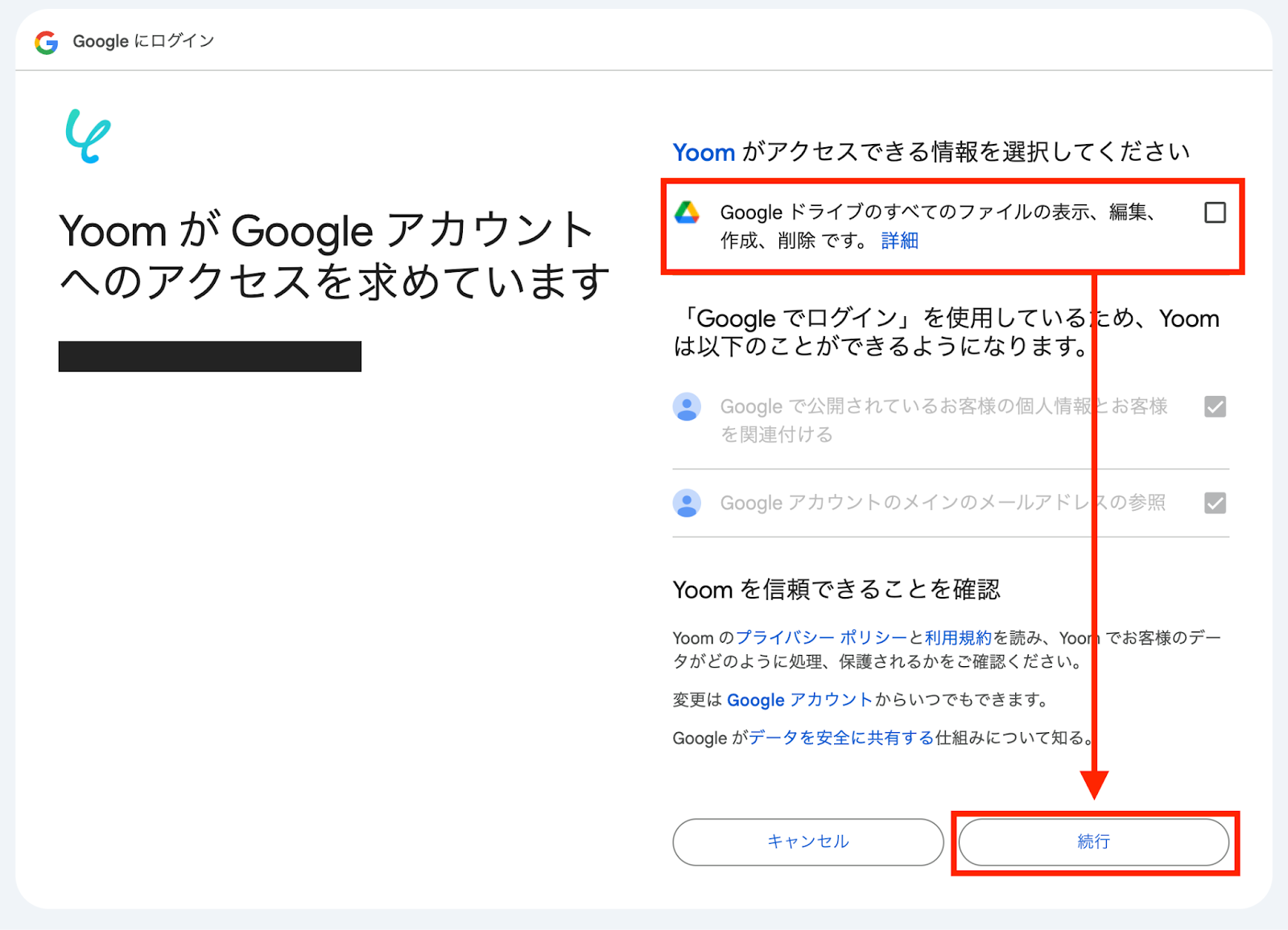 以下のアクセスリクエストの画面が表示されたら「Googleドライブのすべてのファイルの表示、編集、作成、削除」にチェックを入れ、「続行」をクリックしてくださいね。
