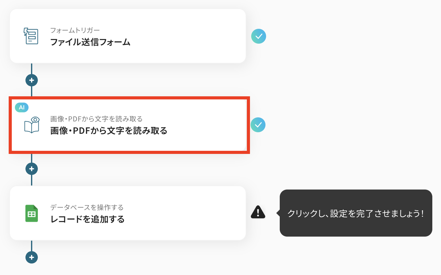 次に、フォームで受け取ったファイルの内容を、OCRで読み取るアクションを設定します。「画像・PDFから文字を読み取る」をクリックしてください。