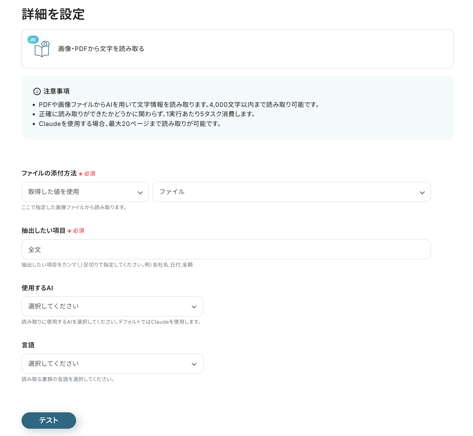 設定を終えたら「テスト」をクリックし、ステップ3でアップロードしたテスト用ファイルの内容が読み取れているか確認しましょう。 問題なければ保存し、OCRの設定は完了です!
