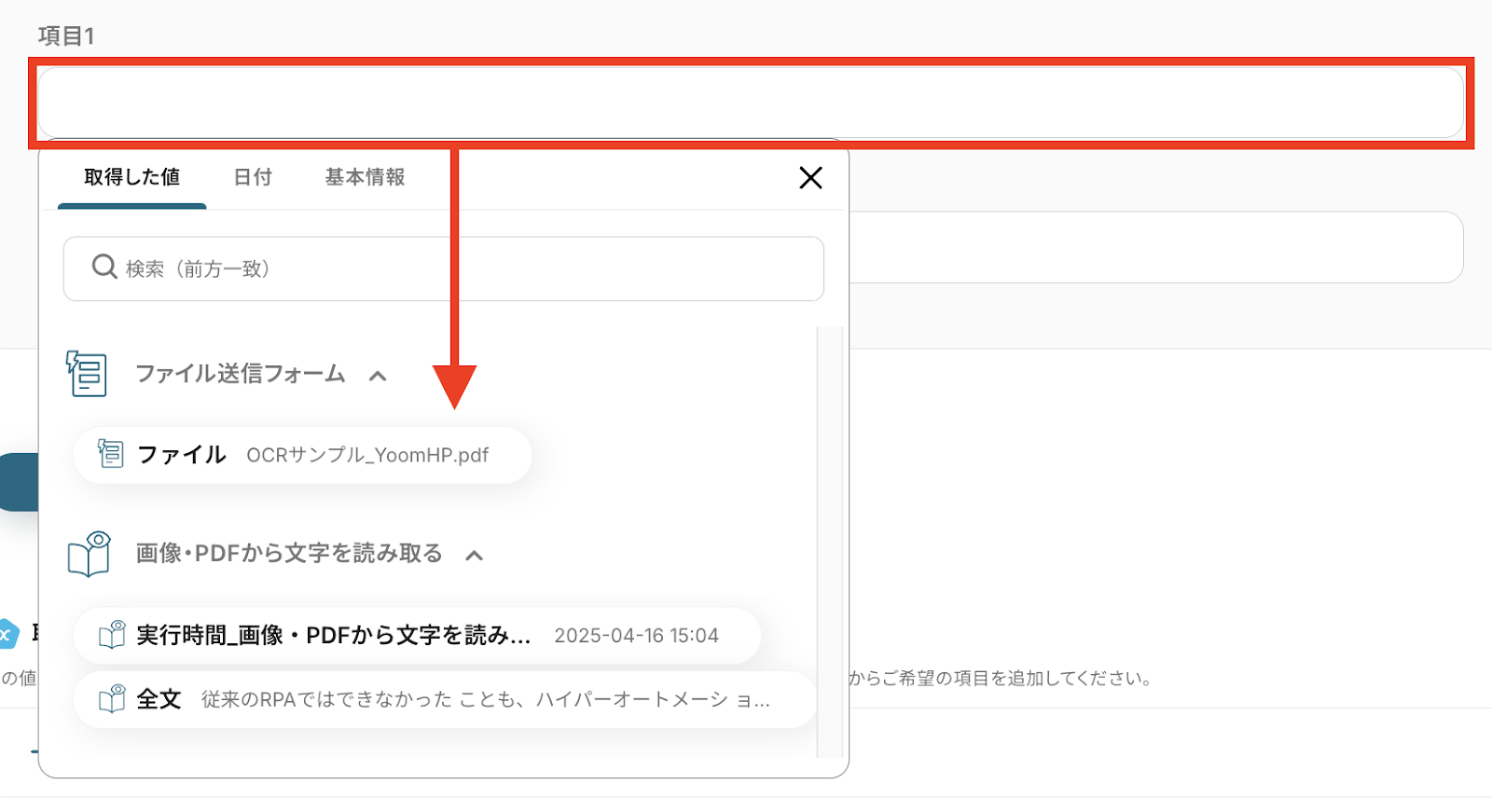 以下のように、各入力欄をクリックし、フォームに添付したファイル名やOCRで読み取った項目など、適したものを選択して設定しましょう。 今回は、項目1に「ファイル(ファイル名)」、項目2に「全文」を設定しました!