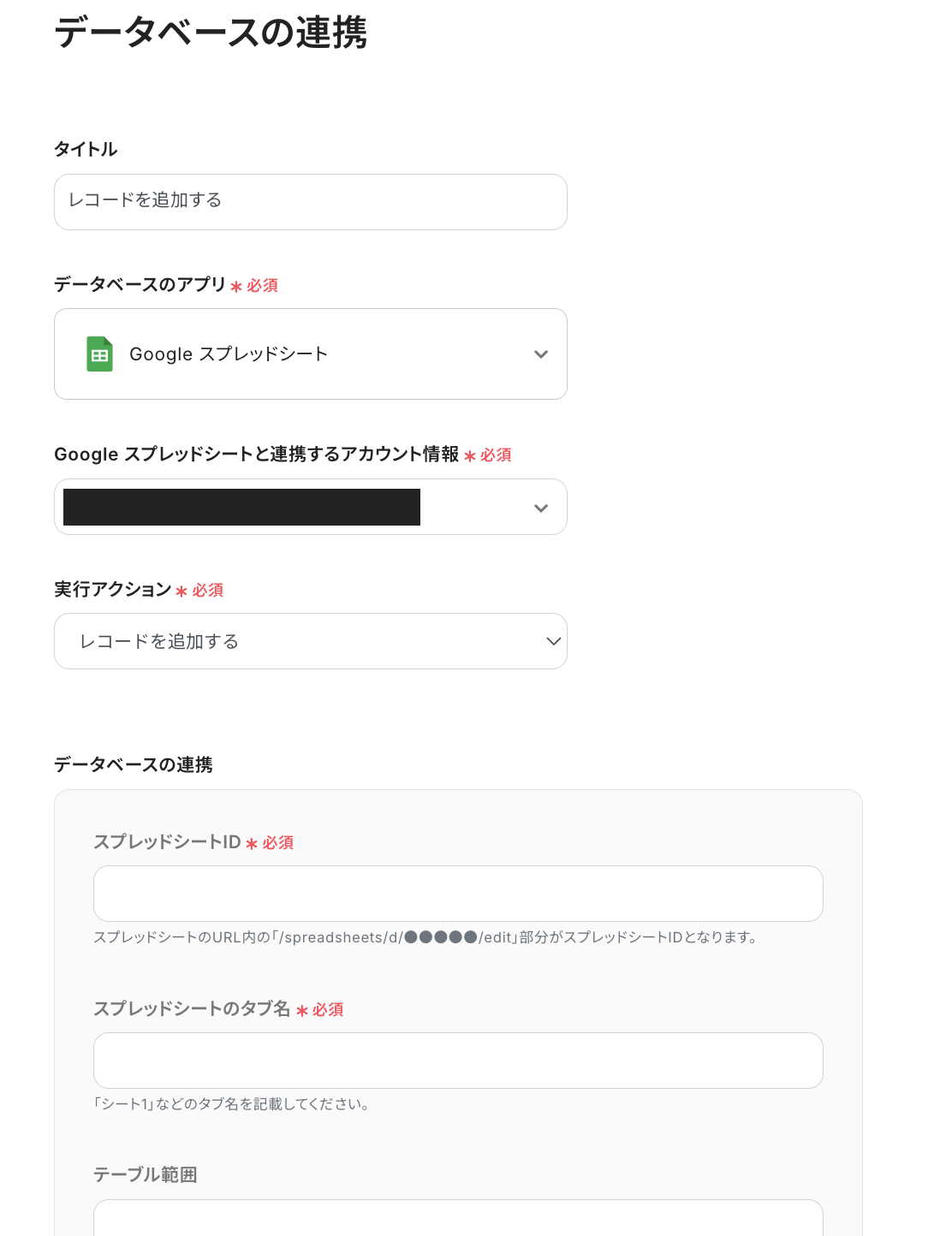 以下の画面で連携アカウントなどを確認します。 「スプレッドシートID」以降の3つの項目に、案内に従って、OCRで読み取った内容を保存したいシートの情報を設定しましょう!