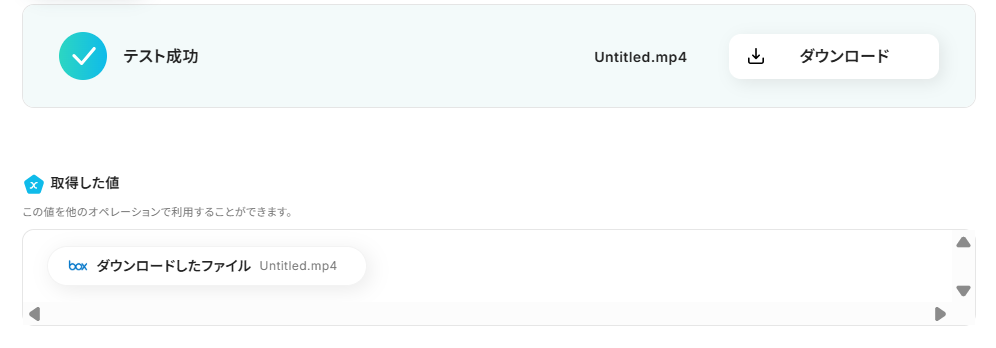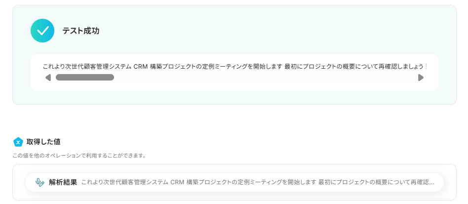 5.設定後、「テスト」をクリックしてください。テストが成功した場合は、アウトプットが取得できます。