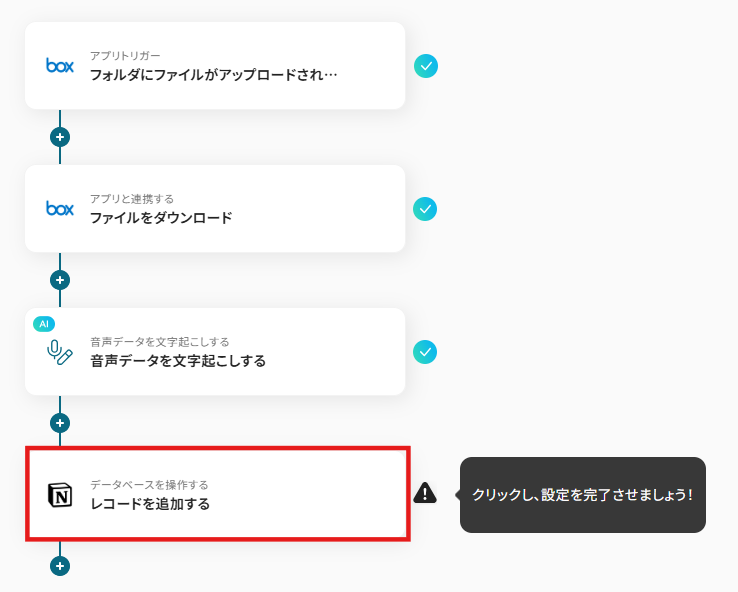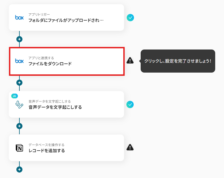 それではここから代表的な例として、Boxに動画ファイルがアップロードされた際に、自動で音声を抽出し文字起こしを行い、その結果をNotionに記録するフローを解説していきます!