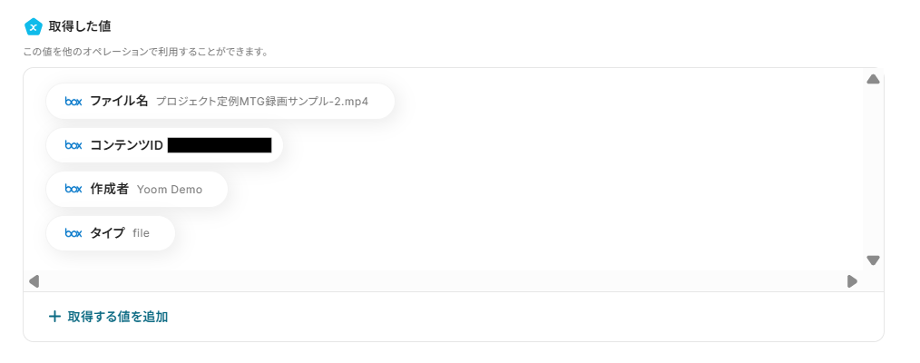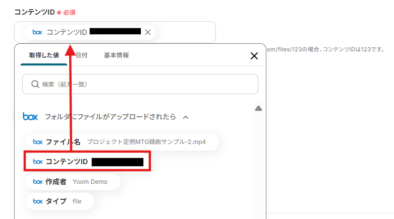 4.次にYoomに戻り、「フォルダのコンテンツID」を赤枠の注釈を参考に入力します。