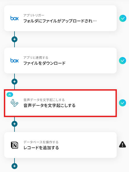 「Boxに動画ファイルがアップロードされたら、音声を抽出し文字起こししてNotionに追加する」フローは、動画管理と情報共有をシームレスに行う業務ワークフローです。