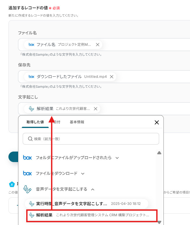 4.「追加するレコードの値」は、先ほど取得したアウトプットから選択します。