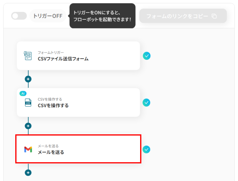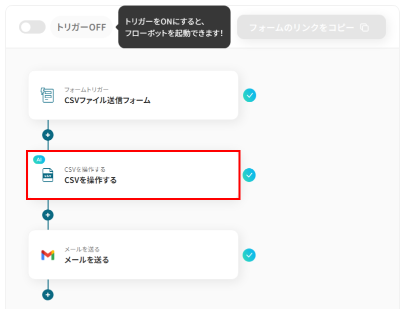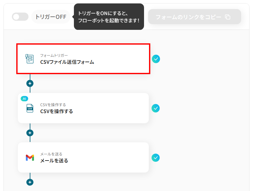 それではここから代表的な例として、YoomのフォームでCSVファイルを受け取ったら、特定の条件でデータを抽出し、その結果をGmailで送信するフローを解説していきます!
