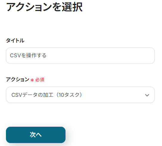 「アクション」は、デフォルトで「CSVデータの加工(10タスク)」が選択されています。今回は、CSVデータの加工が目的ですのでこのままで大丈夫です。