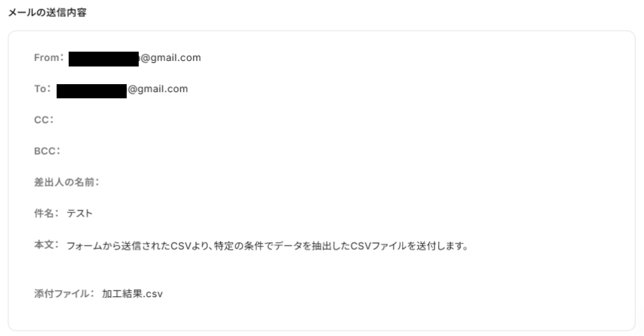 さらに、この抽出されたデータをGmailを通じて指定の受信者に自動送信するため、手作業によるデータ処理やメール送信の手間を削減できます。