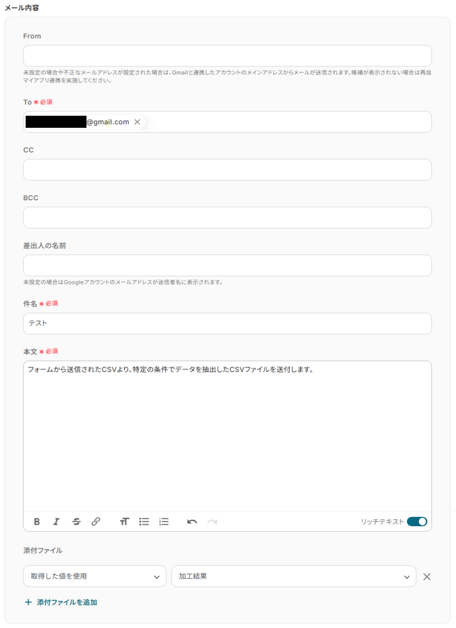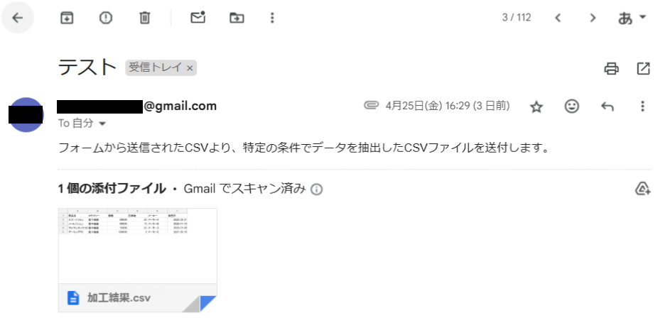 フォームで受け取ったCSVファイルから条件に合うデータを抽出し、その結果をGmailやOutlookなどのメールツールを使って関係者に自動で送信することができるので、定期的なレポート送付や関係部署への情報連携がスムーズです!