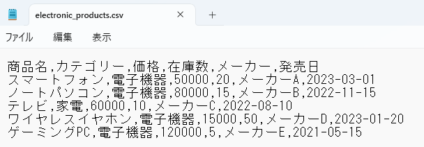 ここには、対象となるCSVファイルをアップロードしましょう。今回はテストなので、下記のようなCSVファイルを準備しアップロードしました。