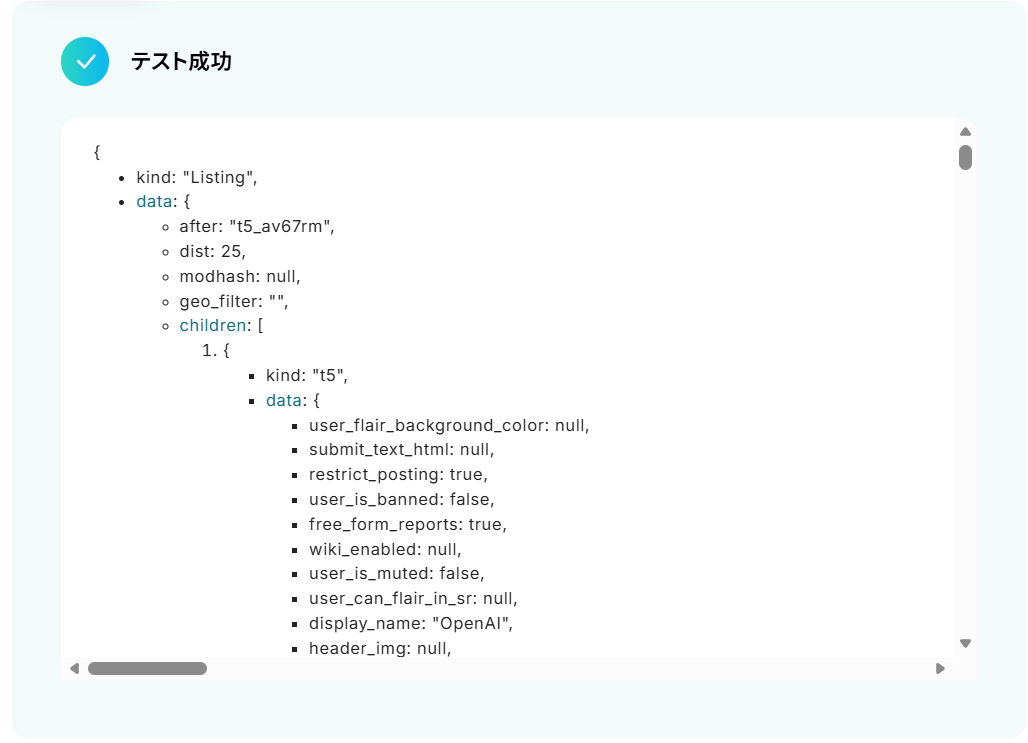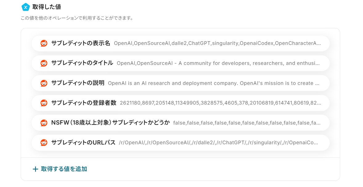 テストに成功すると「取得した値」にRedditの情報が反映されます。