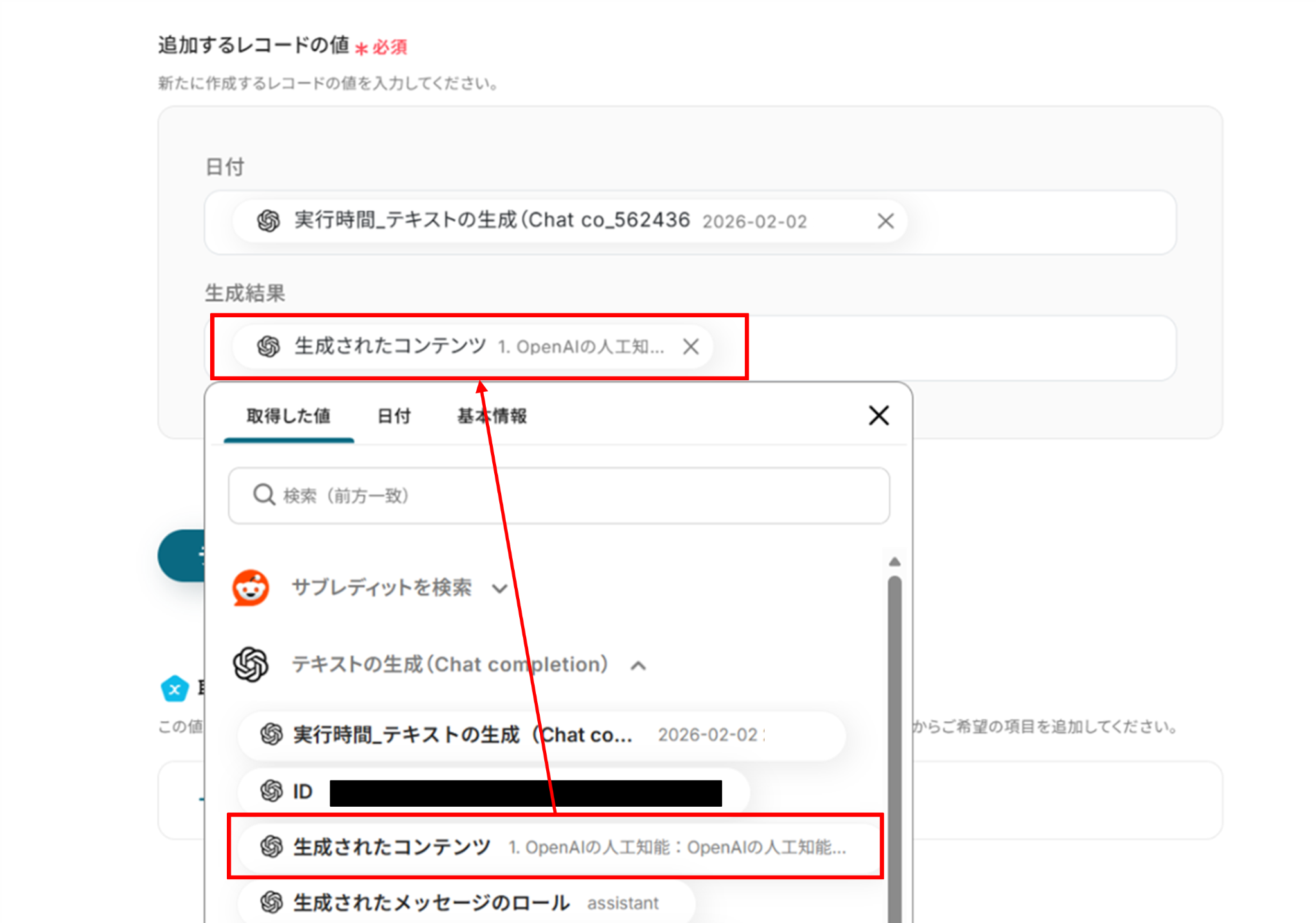 - OpenAIの「テキストの生成(Chat completion)」アクションでは、要約や分析など目的に合わせた指示内容(プロンプト)を任意で設定し、利用したいモデルIDを選択してください