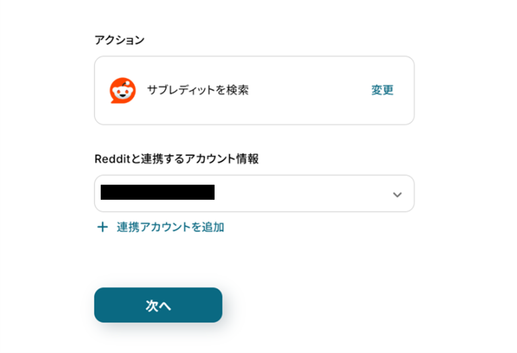 (2)「連携アカウントとアクションを選択」画面から、Redditと連携するアカウント情報に誤りがないかを確認し、アクションは「サブレディットを検索」のままで「次へ」をクリックしましょう。
