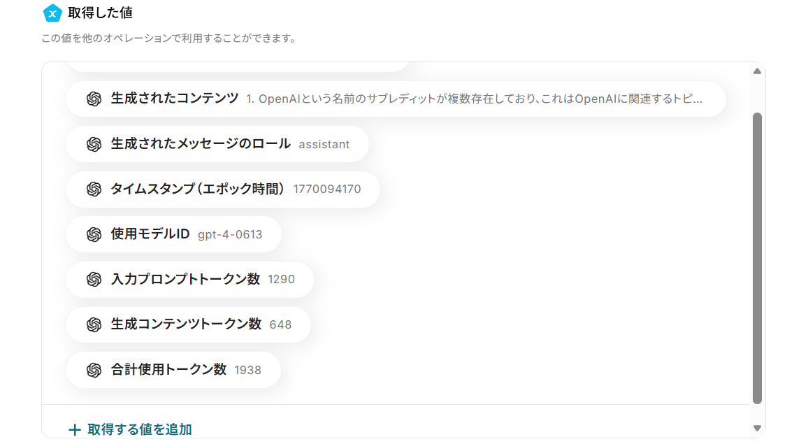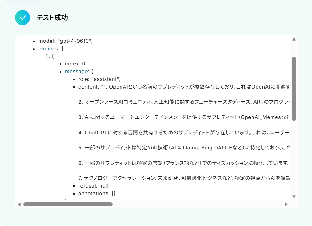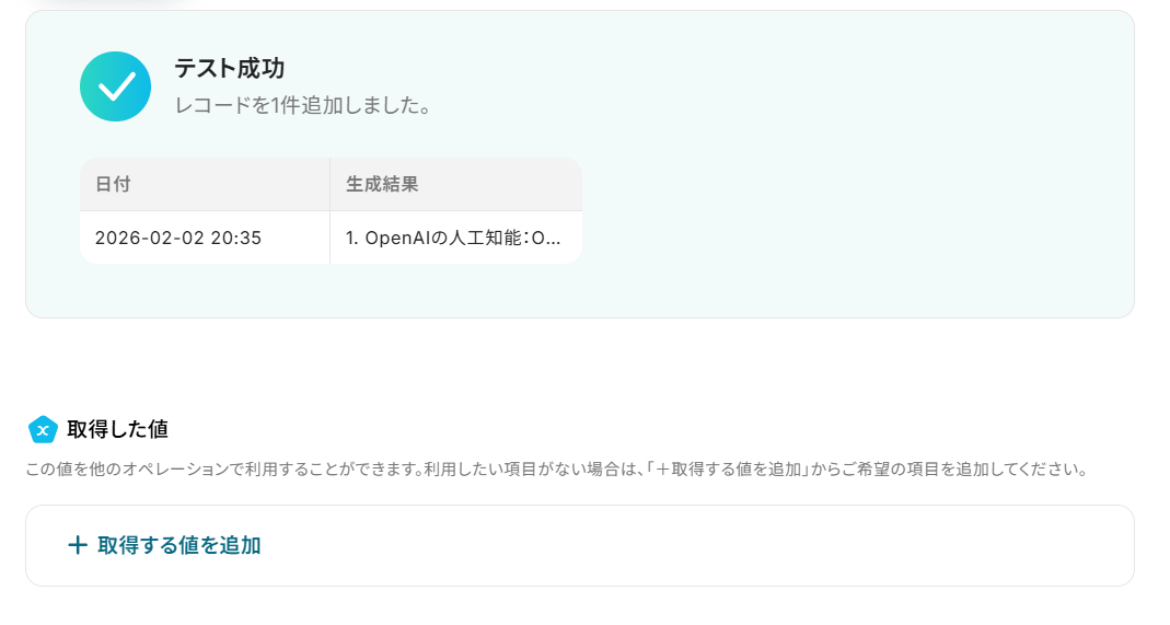 テストに成功すると、取得した値にOpenAIで生成されたテキストが追加されます!