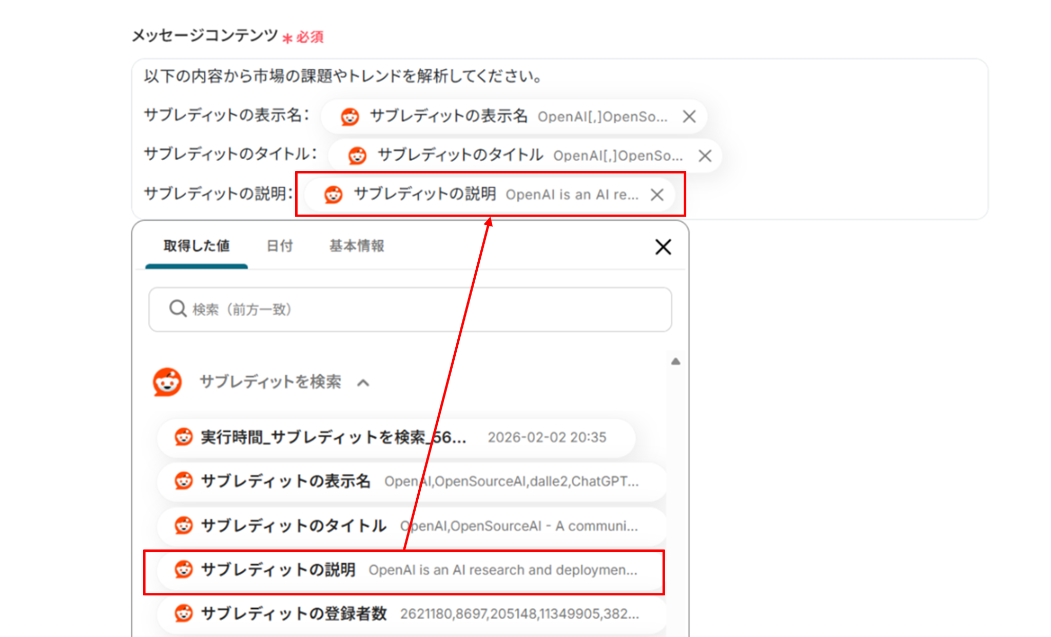 - AI機能のオペレーションでは、Redditの投稿情報(タイトル、本文など)の中から、どのデータを抽出するかを任意で指定できます。