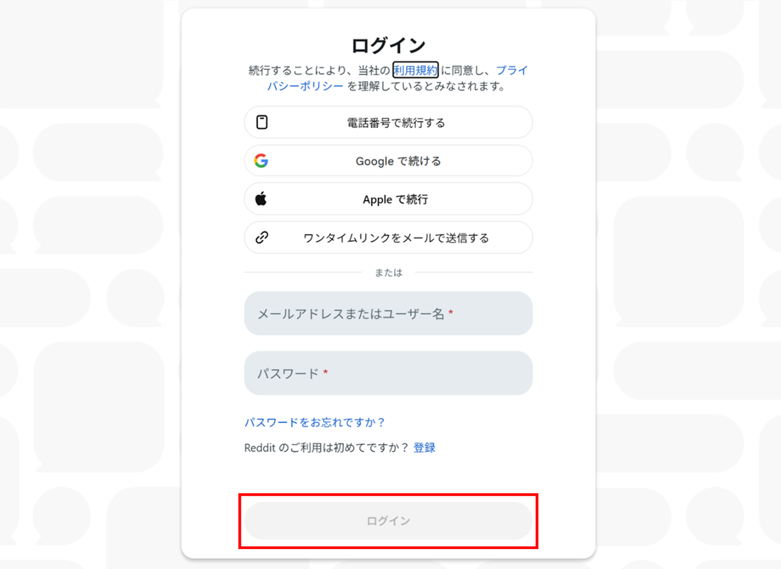 (2)Redditのログイン画面に移動するので、メールアドレスとパスワードを入力しログインしましょう。