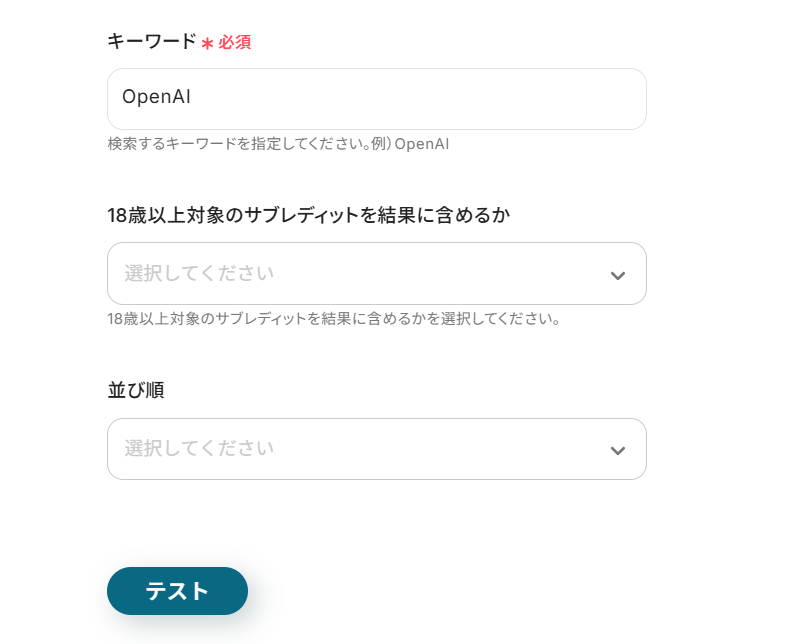 - Redditの「サブレディットを検索」アクションでは、調査したい任意のキーワード、並び順などを設定してください