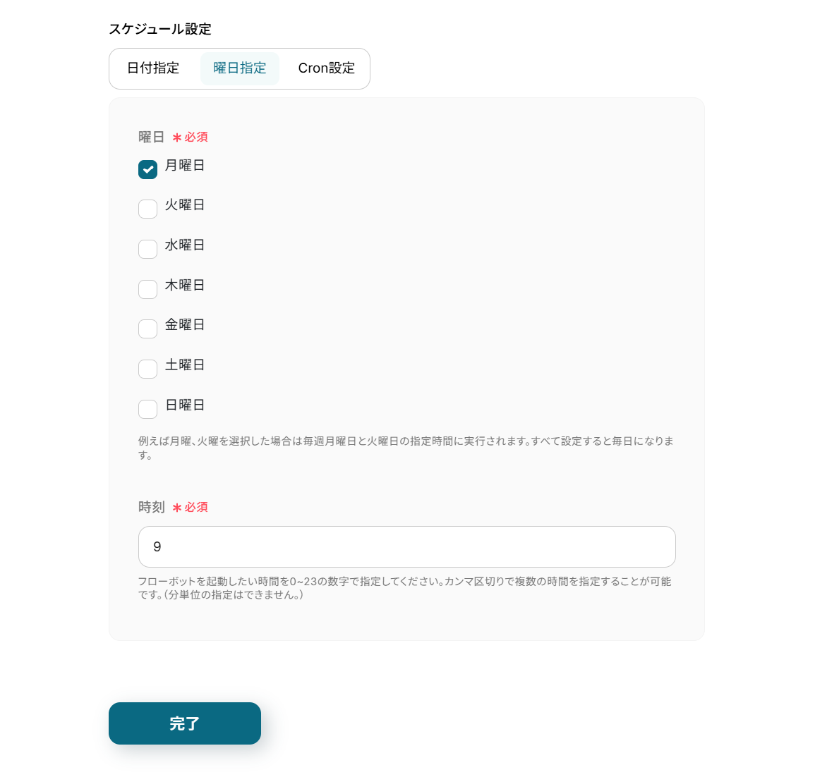 (2)スケジュール設定は日付指定、曜日指定、Cron設定と自由に起動タイミングを選択できます。