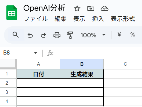 Yoomで設定をする前に、Google スプレッドシートにテスト用のシートを作成します。