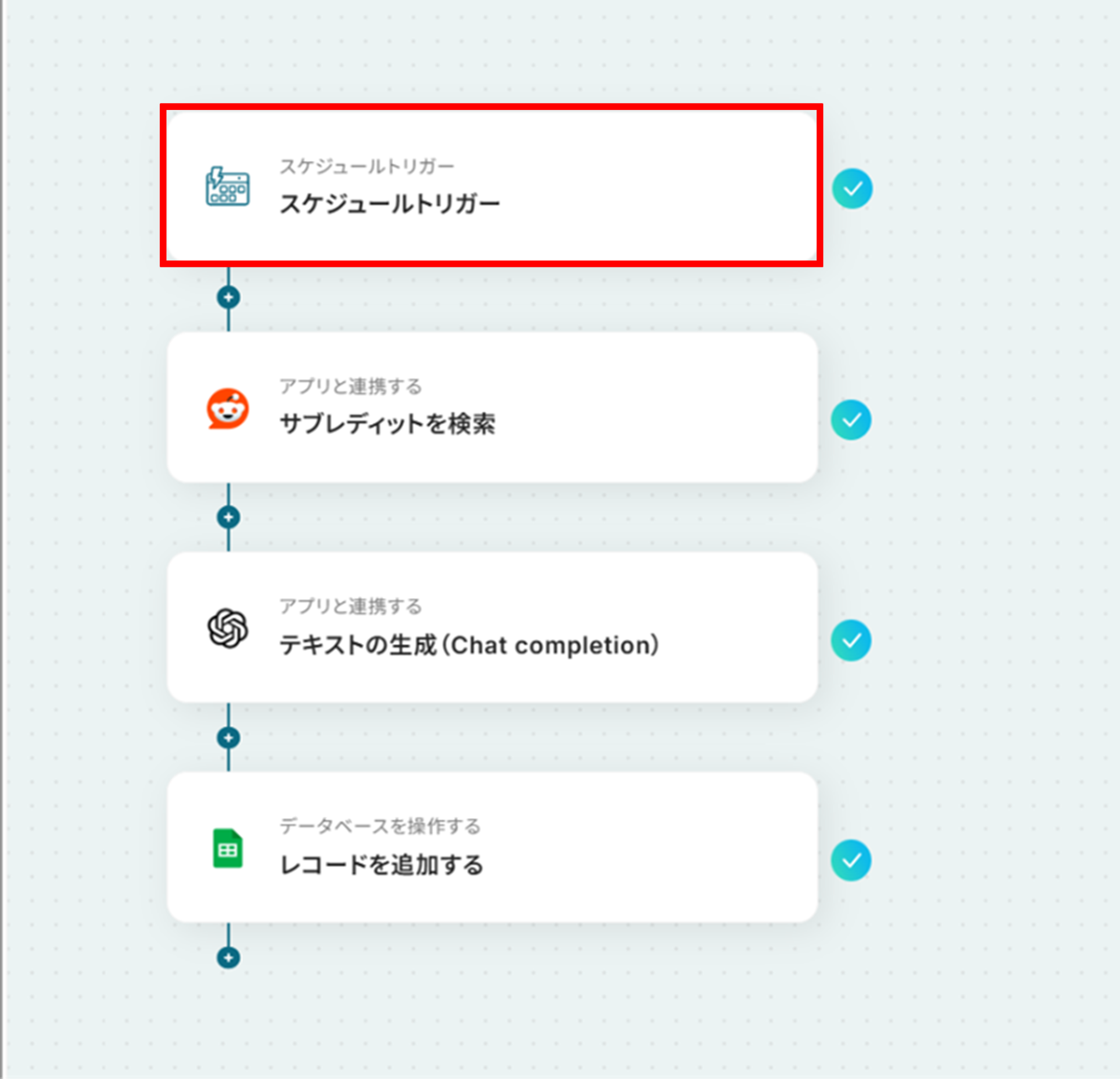 - スケジュールのトリガー設定とReddit、OpenAI、Google スプレッドシートのアクション設定