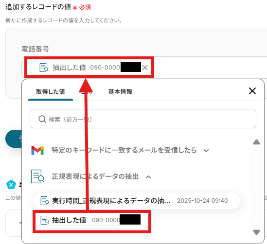 追加するレコードの値は、抽出した値を取得した値より選んでください。