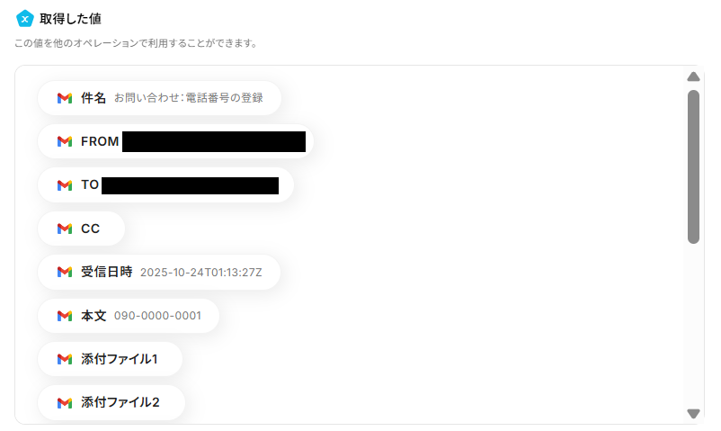 取得した値とは、トリガーやオペレーション設定時に、「テスト」を実行して取得した値のことを指します。