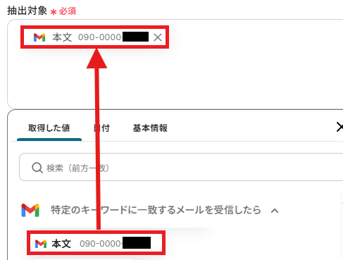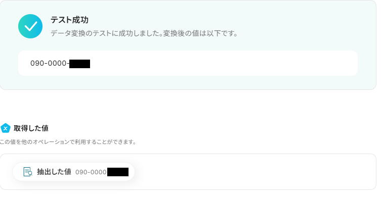 - 抽出箇所を正規表現で指定:0[6-9]0-\d{4}-\d{4}(デフォルト)